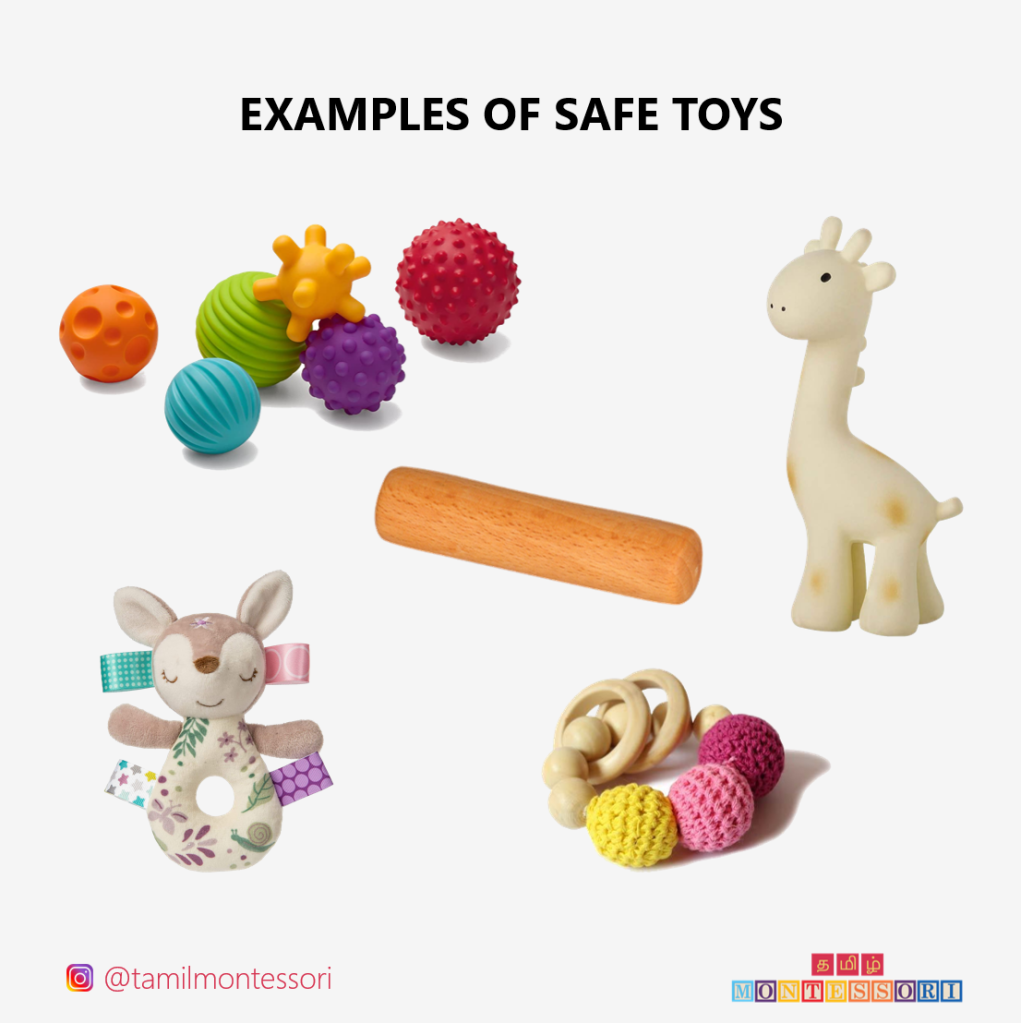 It comprises of items made of wood, fabric, silicone that cannot be swallowed.