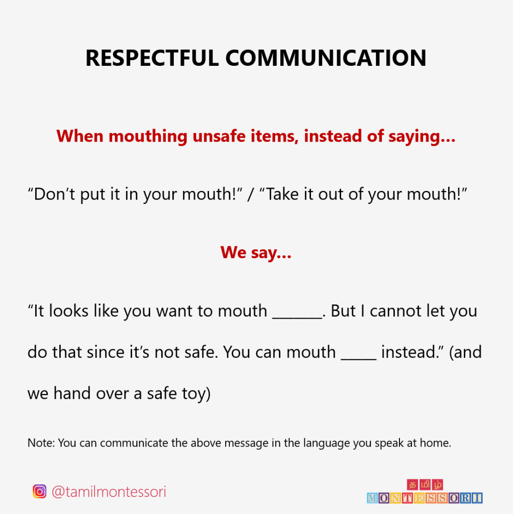 When mouthing unsafe items, instead of saying “Don’t put it in your mouth!” or “Take it out of your mouth!”, we say