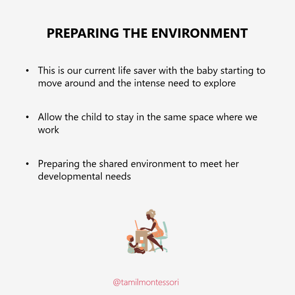 With the baby starting to move around and the intense need to explore, letting the child stay in the same space where we work and preparing this environment to meet her developmental needs has been helpful.