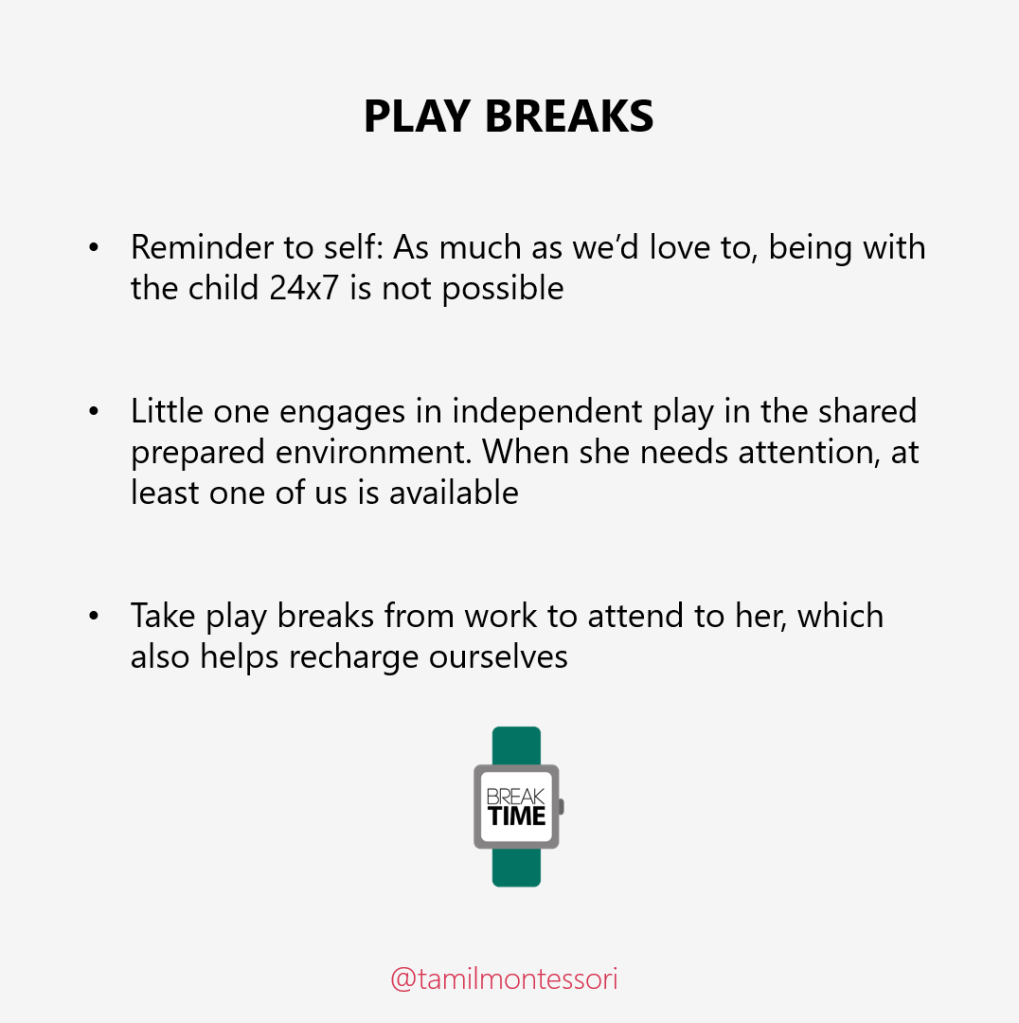 Keeping the child entertained 24×7 is not possible. As much as the little one engages in independent play, when she needs attention, at least one of us is available. We take play breaks from work to attend to her, which also helps recharge ourselves.