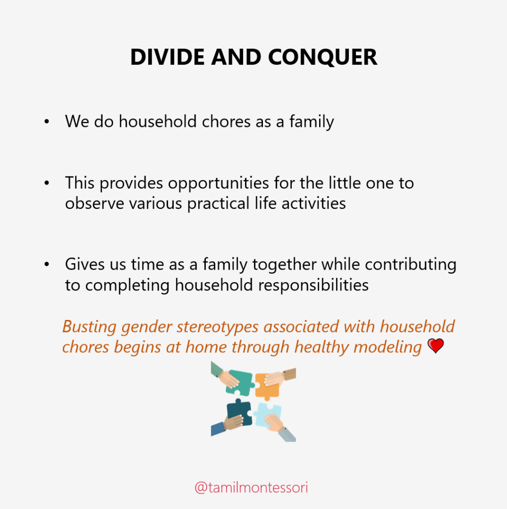 We do household chores as a family which provides opportunities for the little one to observe the various practical life activities. This gives us time as a family together while contributing to completing the household responsibilities. Busting gender stereotypes associated with household chores begins at home through healthy modeling. 🙂