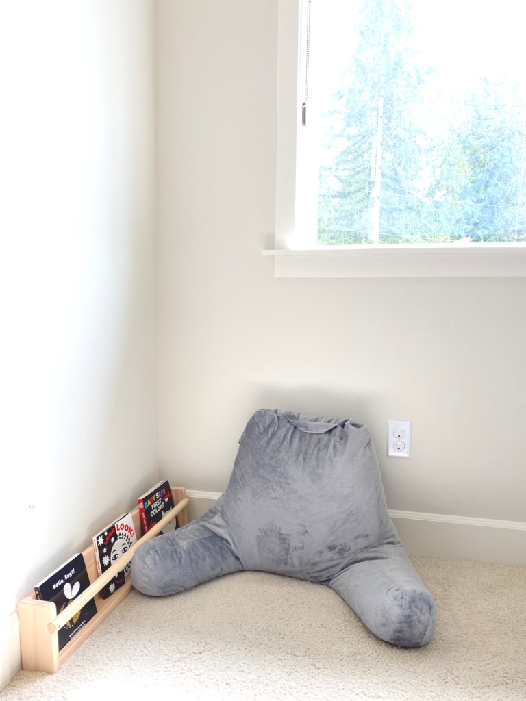 3. Prepared environment: Create an environment for reading; it can be as simple as having a reading pillow and a display rack to hold a few books. We have multiple reading spaces throughout the home wherever we spend time together so that we have more opportunities to read whenever and wherever we want. In each reading space we have about 4 or 5 books. Also, the display racks are low-lying which means LO has access to them. Since she has been crawling and pulling out things, having accessible book racks are inviting to her.