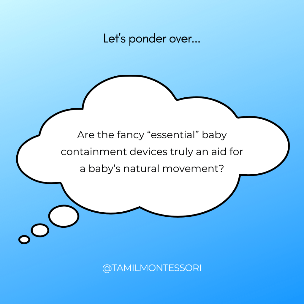 Let’s take a moment to look at the number of such baby equipment around us and ask ourselves if it is really an aid for natural movement to the baby or is it a matter of convenience to adults. 😊 It’s best to avoid them, but if that’s not possible, look for ways to limit the time babies spend in these devices.